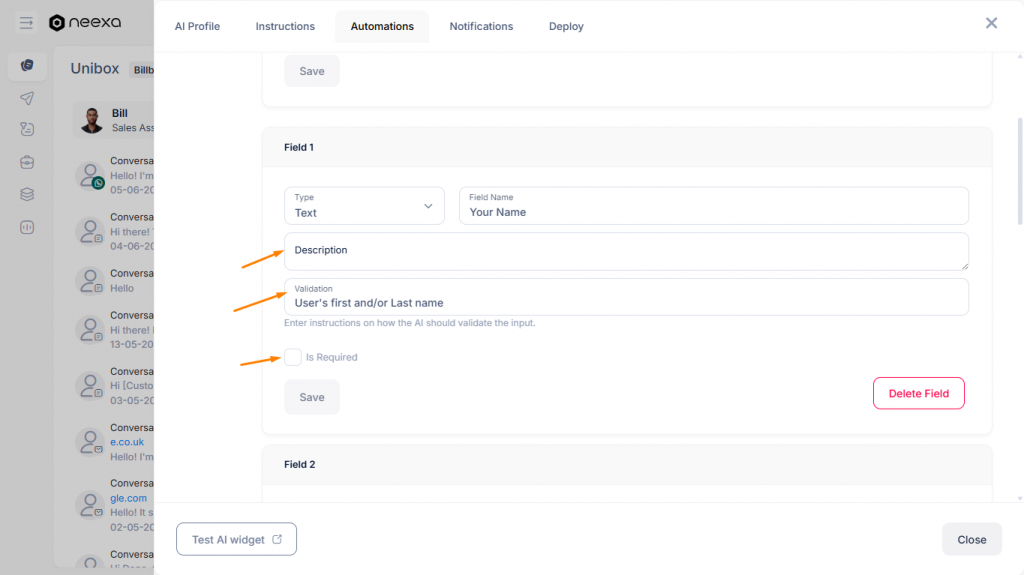 Data Collection & Database How To Enable Conversational Data Collection Estimated reading: 3 minutes Last Updated 23/05/2025 Before Neexa can start building your contact Database, data collection needs to be enabled. This allows your AI agent to automatically capture and store lead information from conversations across your connected channels — like your website, Instagram, email, or WhatsApp. This article walks you through exactly how to enable data collection in just a few steps. Turning On Data Collection go to Your Unibox Click Settings Icon Click Automations Click Database on the left panel toggle ON Set a Condition Decide when the AI should start collecting user data. You can choose between: User Message Count – e.g., after the user has sent 3 messages AI Response Count – e.g., after the AI has replied 2 times Set the condition value (the exact number that triggers data collection). Choose Data Collection Style Data First – The AI collects the required information before continuing the conversation. Smart Assist – The AI responds helpfully while collecting the data during the conversation. Customize What Data Is Collected Tell the AI what kind of customer data you want to collect. Phone Number Email Address Text ( i.e. name, business, country etc.) Numeric Date Select (Create your own options from a dropdown) Understanding Each Field Setting in Data Collection When setting up custom fields for your AI to collect (like Name, Email, Phone Number, etc.), you’ll see three options: Description, Validation, and Required. Here’s what each one means and how to use it effectively: Description This is a short note to help you (and your team) understand what the field is meant to collect. For example: If the field is “Name,” the description might be: “This is the user’s name” For “Email,” the description could be: “This is the User’s E-mail.” Validation This tells the AI what kind of input is acceptable. In other words, it helps the AI know whether the user gave a valid response or not. Examples: For an email field, the validation should check if the input looks like a real email (e.g., someone@example.com) For a phone number, it might check for correct number length or digits only ⚠️ Without validation, the AI may accept incorrect or incomplete responses (like “yes” as an email). Required This setting decides whether the field is mandatory or optional. If Required is ON ✅:The AI will insist on collecting that field before continuing the conversation. If Required is OFF ❌:The AI will ask for the field, but it won’t push or follow up if the user skips it. Use it wisely Pro Tip: Keep the conversation smooth. Only mark what you really need as required, so the AI doesn’t come across as pushy or repetitive. Click Save to save settings That’s it! Your AI agent will now begin collecting contact data from all qualifying conversations. How It Works Behind the Scenes Once enabled: Neexa will detect when a user shares contact information in a chat. That data is automatically stored in your Database, along with the conversation context and source. You can monitor, filter, or export these entries anytime. ⚠️ Important Note If data collection is disabled, your AI will still chat with users, but none of their contact information will be saved for future follow-up or analysis. Make sure it’s turned on if you want your CRM and follow-ups to work correctly. 📘 Related Resources What is Autonomous CRM? Data Collection & Database - Previous What is Conversational Data Collection? Next - Data Collection & Database Data First vs. Smart Assist: What’s the Difference?