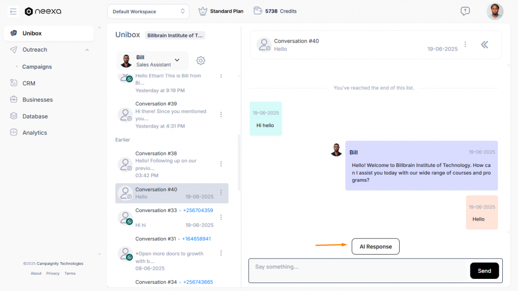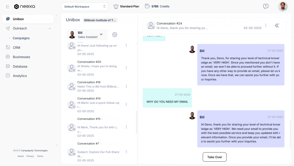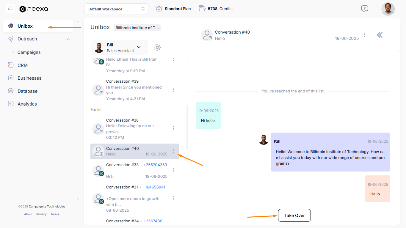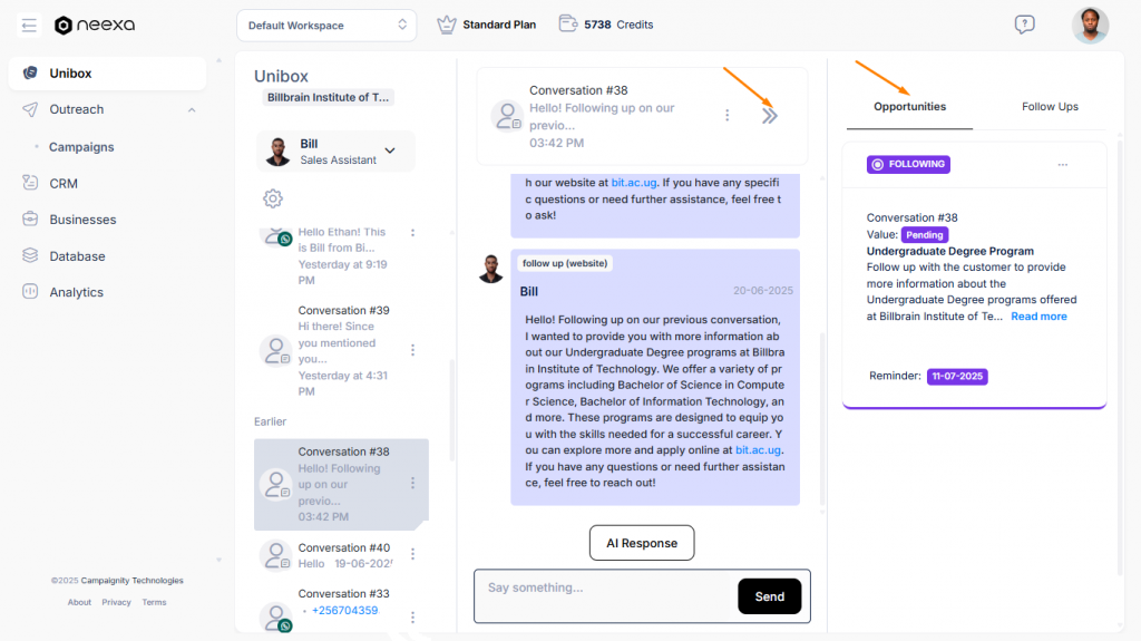 The Unibox What is the Unibox? Estimated reading: 2 minutes Last Updated 23/05/2025 Unibox is your central space to view and manage all customer conversations, for each business you’ve added to your workspace. Whether your AI agent is chatting with customers or a lead is being followed up, Unibox shows you everything happening in real-time, so you’re always in control. What You Can Do in the Unibox: 1. View Conversations for your Business Once you select a business, the Unibox updates to show: All active and completed conversations for that business Messages from different channels (WhatsApp, Web chat, Facebook, Instagram, E-mail) AI agent responses in each chat The follow-up journey for any customer opportunities 2. Step In with Takeover Mode Sometimes the AI may not have enough context, or you might want to clarify something directly. Use Takeover to: Pause the AI mid-conversation Respond manually to the customer Return control to the AI when you’re done This lets you step in seamlessly, without disrupting the customer experience. ⚠️ Important: After you’re done, don’t forget to switch back to AI Response mode.If you don’t, the AI will remain paused, meaning new messages from that customer won’t be answered until you step in again. Always return control to the AI to keep replies instant. 3. Track Opportunities and Follow-ups Neexa automatically identifies and follows up with promising leads once the CRM is enabled. Within each conversation, you can see: If an opportunity is being followed up What stage of the journey it’s in How the AI is managing the follow-up This helps you separate general inquiries from high-value opportunities and act accordingly. How to view opportunities Click the three dots (⋯) at the end of each conversation to reveal additional option, including the ability to view opportunity details or delete the conversation if needed or you can click the arrows on the left side of each chat to expand the Opportunity Panel Why the Unibox Matters The Unibox isn’t just for reading messages. It gives you: Clear visibility into how your AI agent is engaging customers The power to act when a human touch is needed A real-time view of sales opportunities being nurtured by your AI Pro Tips: Don’t forget to switch businesses if you manage more than one, each has its own Unibox view. Check Unibox regularly to stay on top of conversations and follow-ups. Use Takeover for context-specific replies or high-stakes conversations. Next - The Unibox Getting Started with the Unibox